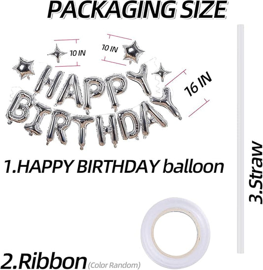Silver Happy Birthday Banner Balloon Aluminum Foil 16 Inch Letter,10 Inch Five Pointed Star Four Pointed Star Suitable for Kids, Men, Women, Boys and Girls Party Decoration Supplies